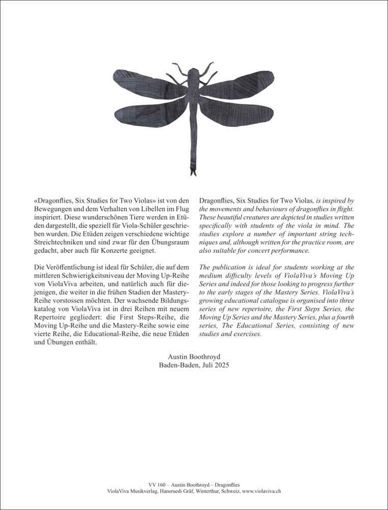 «Dragonflies, Six Studies for Two Violas» ist von den Bewegungen und dem Verhalten von Libellen im Flug inspiriert. Diese wunderschönen Tiere werden in Etüden dargestellt, die speziell für Viola-Schüler geschrieben wurden. Die Etüden zeigen verschiedene wichtige Streichtechniken und sind zwar für den Übungsraum gedacht, aber auch für Konzerte geeignet.
